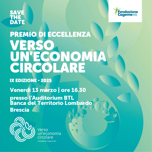 Siamo lieti di annunciare la cerimonia di premiazione dei vincitori della IX edizione del Premio di Eccellenza “Verso un’Economia Circolare” 2025, promosso da Fondazione Cogeme ETS in collaborazione con Kyoto Club, Circularity e numerosi altri partner. L’evento si terrà venerdì 13 marzo 2026 alle ore 16:30, presso l’Auditorium BTL – Banca del Territorio Lombardo di...